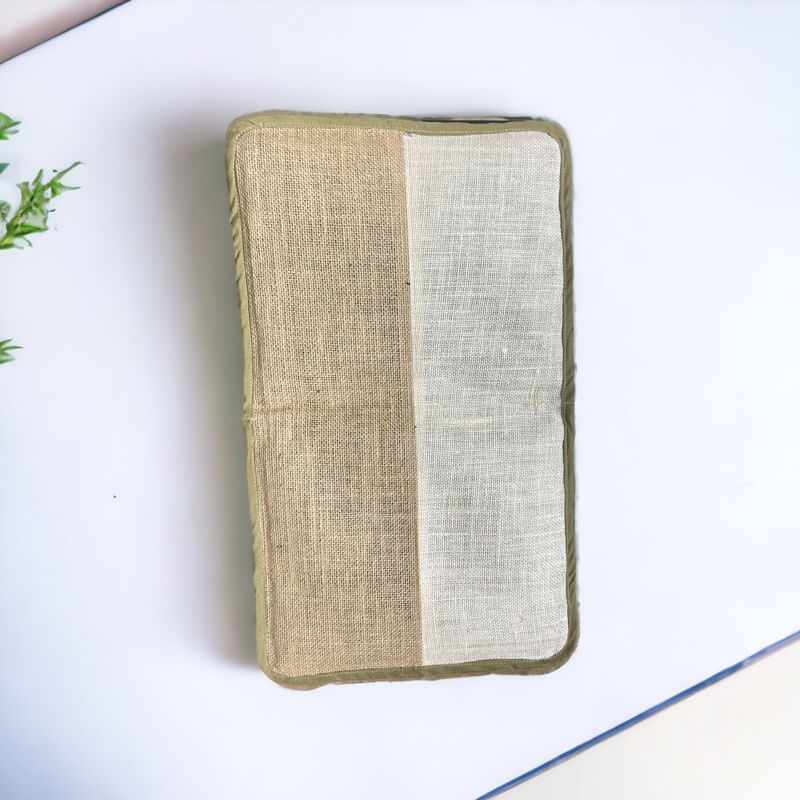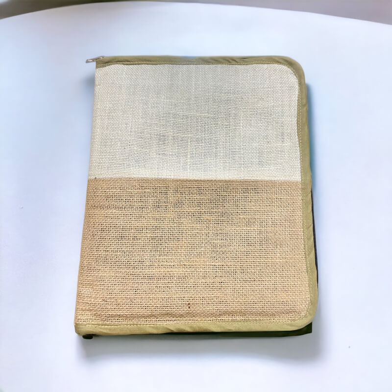 This file folder is a stationary item made from natural jute fibers. The jute file folder is designed to store and organize documents, files, and other important papers. This has two pockets inside.